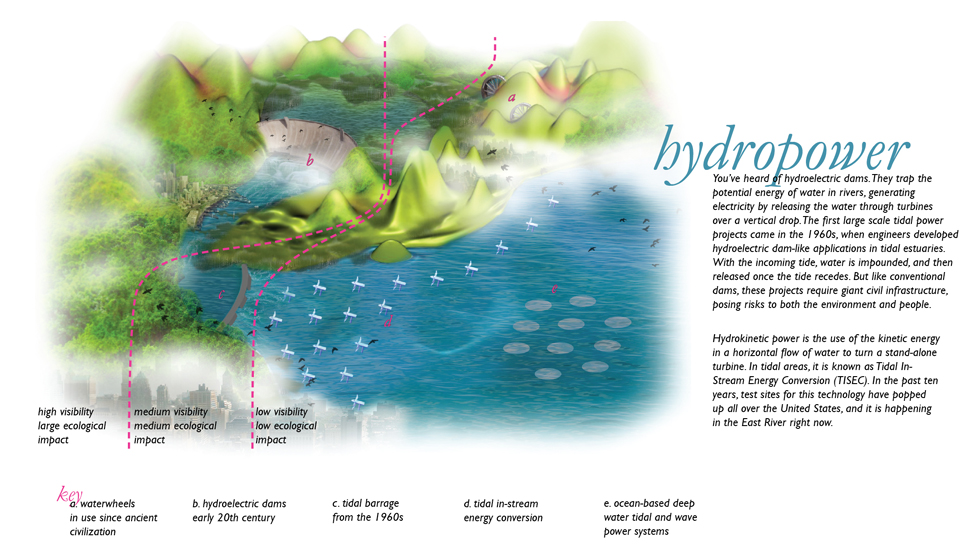 The illustrated slideshow above outlines the basic facts about tidal in-stream energy conversion (TISEC), posing questions about how design expertise – particularly in terms of the micro-scale of the turbines themselves and the macro-scale of urban waterways generally – can and should be brought to bear on this crucial discussion about renewable energy, the role the East River plays in New York City, and the relationship between environmentalism, ecology and urbanism.