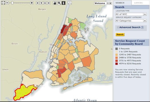 New York’s got its latest app. As part of an ongoing effort to marry government responsiveness and crowdsourcing technology, the City unveiled an interactive map charting 311 calls across New York neighborhoods this week. From NYC.gov, New Yorkers can now chart which communities are the most vociferous by how many 311 requests have been made in the last 5 days (apparently it’s Washington Heights with 4974 to 6216 requests). Advanced search options let the user narrow down to complaint types, and hone in on the street level to find exactly the spot your neighbor is bemoaning, for example, lack of trees. The map still seems to be getting its kinks worked out, but is already a fun, if slightly voyeuristic, tool to navigate NYC problems.
