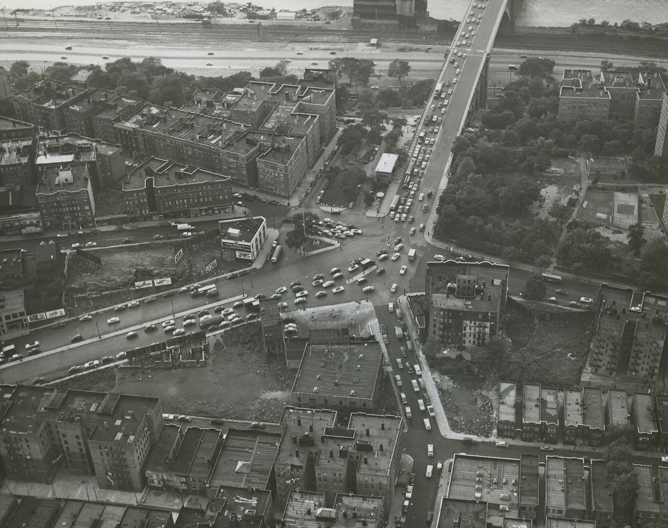 On the occasion of our exhibition Cross Bronx/Living Legend, we asked Bromley, a scholar of planning history who has been engaged with the Bronx for decades, to tell a more fulsome story of the torturous highway. How might we understand the choice of its location, or its short- and long-term effects? The story of the Cross Bronx is one that dates back to the rise of regional planning in the 1920s, one profoundly shaped by the influence of the automobile and associated industries and by the federal government’s postwar privileging of homeowners over renters. It’s a story that’s now almost a century old, and that has roles for many protagonists. Blaming Robert Moses lets US society off easy. Instead, to make sense of the “expressway world” and find a path forward, we’ll do better to engage its full complexity and contradictions than seek simple certainties.