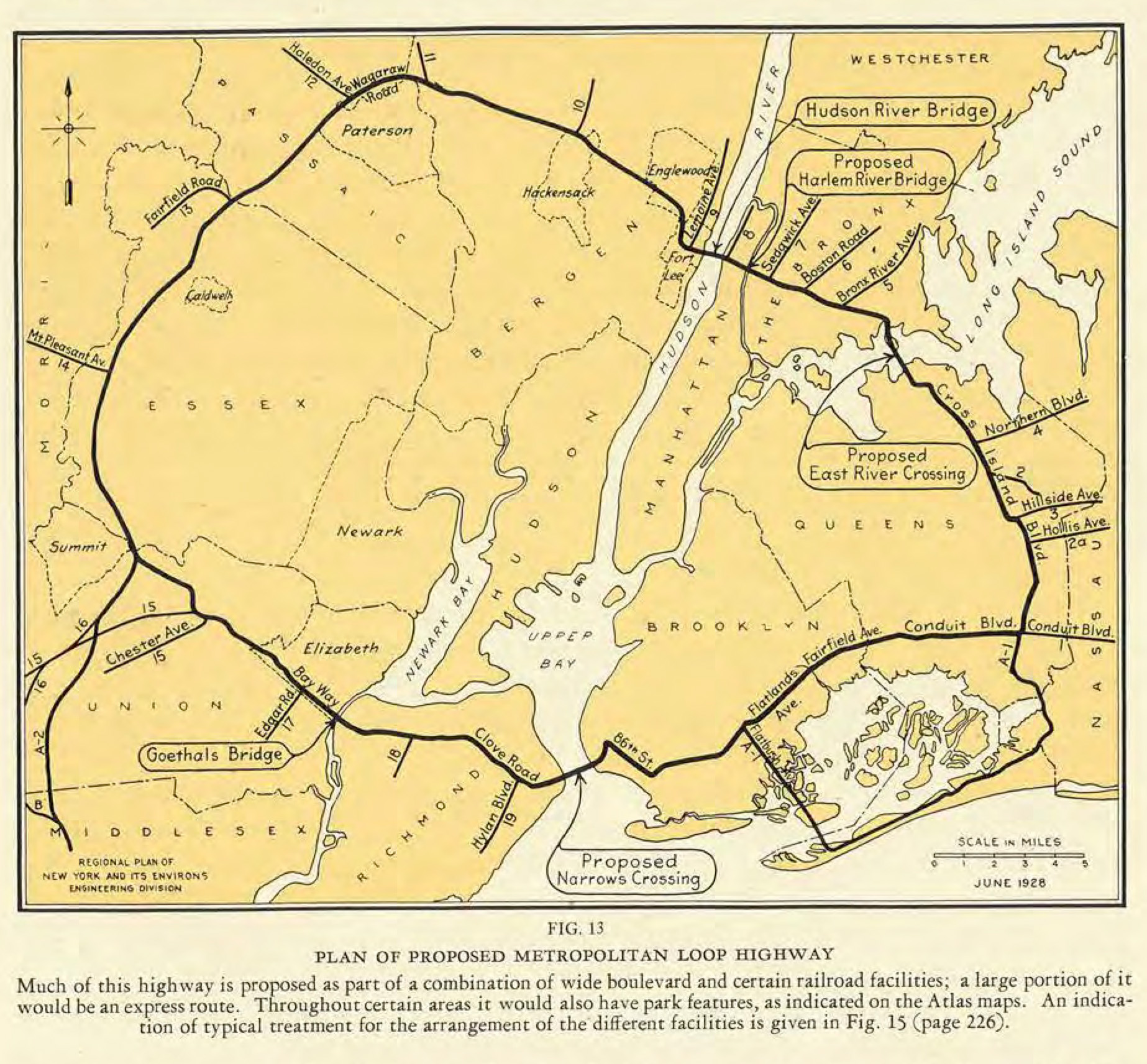 The Regional Plan emphasized the importance of building a circumferential expressway called “The Metropolitan Loop.” It was intended to be the primary highway and freight corridor of the entire metropolitan region, enabling heavy traffic to bypass most of Manhattan and the more densely populated areas of Brooklyn and Queens, and to connect to upstate New York, New England, Long Island, and all points west and south of New York City.