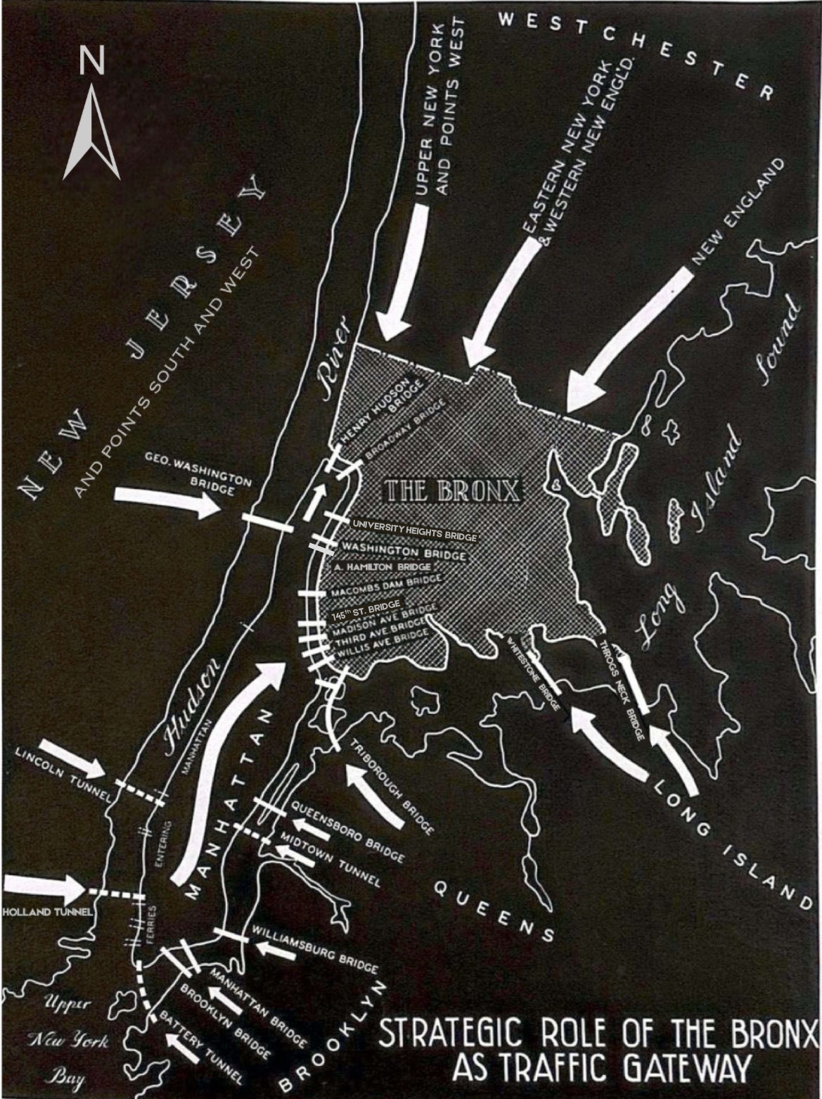 As part of the Loop, the RPA envisaged the CBE would be a great connecting highway, taking advantage of the Bronx’s strategic location as the city’s only mainland borough. The vision of the Bronx as a geopolitically and economically significant “hub” was dominant in Bronx Chamber of Commerce circles between 1935 and 1965: The borough would be a route center for the metropolitan region and the entire northeastern United States. This vision totally ignored the negative aspects of hub status: congestion, traffic noise, air and water pollution, the physical splitting of neighborhoods by rail and highway axes, and demolition of homes to expand highways, parking areas, and highway intersections. Rather, business leaders’ priority was to have as many outside links as possible and to tie them together within the borough, facilitating Bronx prosperity through industry, commerce, warehousing, and vehicle maintenance. Crucial products of this mentality were the opening of the Hunts Point Market in the Bronx in 1962 and the various expansions of the market and associated facilities since then. Other major proposals, none of which were implemented, included a Bronx Airport on the current site of Co-op City, an inter-modal freight terminal and heliport, and a major bus terminal in Mott Haven.