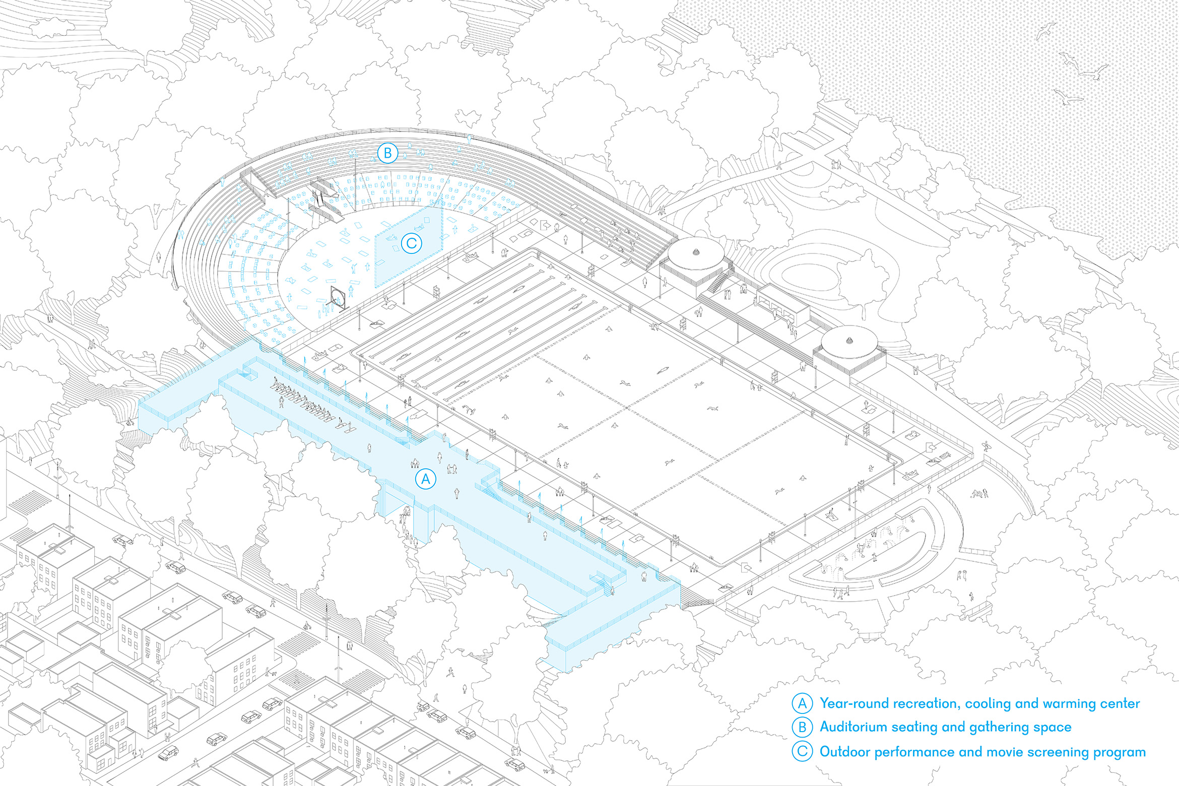 What if we weatherized and adapted all WPA pool-adjacent recreational buildings into designated cooling centers in the summer and warming centers in winter and shoulder seasons? For this proposal, we looked at Astoria Pool, the largest in the city. The former diving pool area on the southern end of the pool can become a year-round performance venue, capitalizing on its existing scale, shape, and auditorium seating to host public programming like dance performances, theater groups, and film screenings.