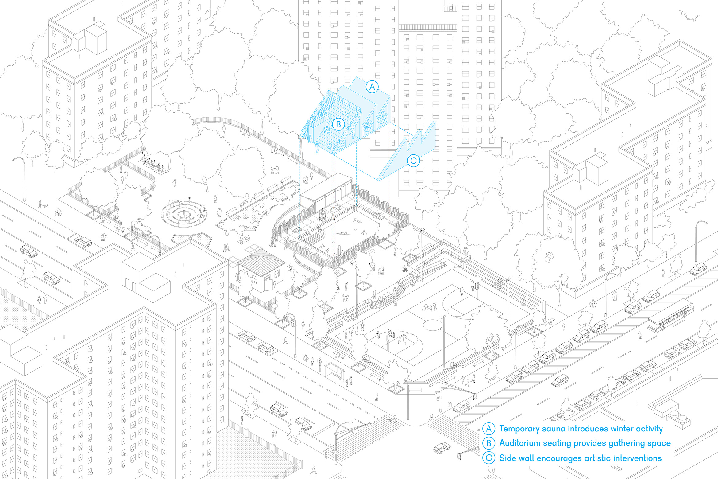 What if we installed saunas on top of mini pools during the shoulder and winter seasons? Aside from their health benefits, public saunas introduce a new and alternative way to engage with bathing culture. Like the original portable mini pools, temporary sauna structures could be placed above any mini pool, providing a new public facility and winter cover for the basin. Additionally, built-in auditorium seating would serve as a community gathering space, outdoor classroom, or seating for movie screenings.