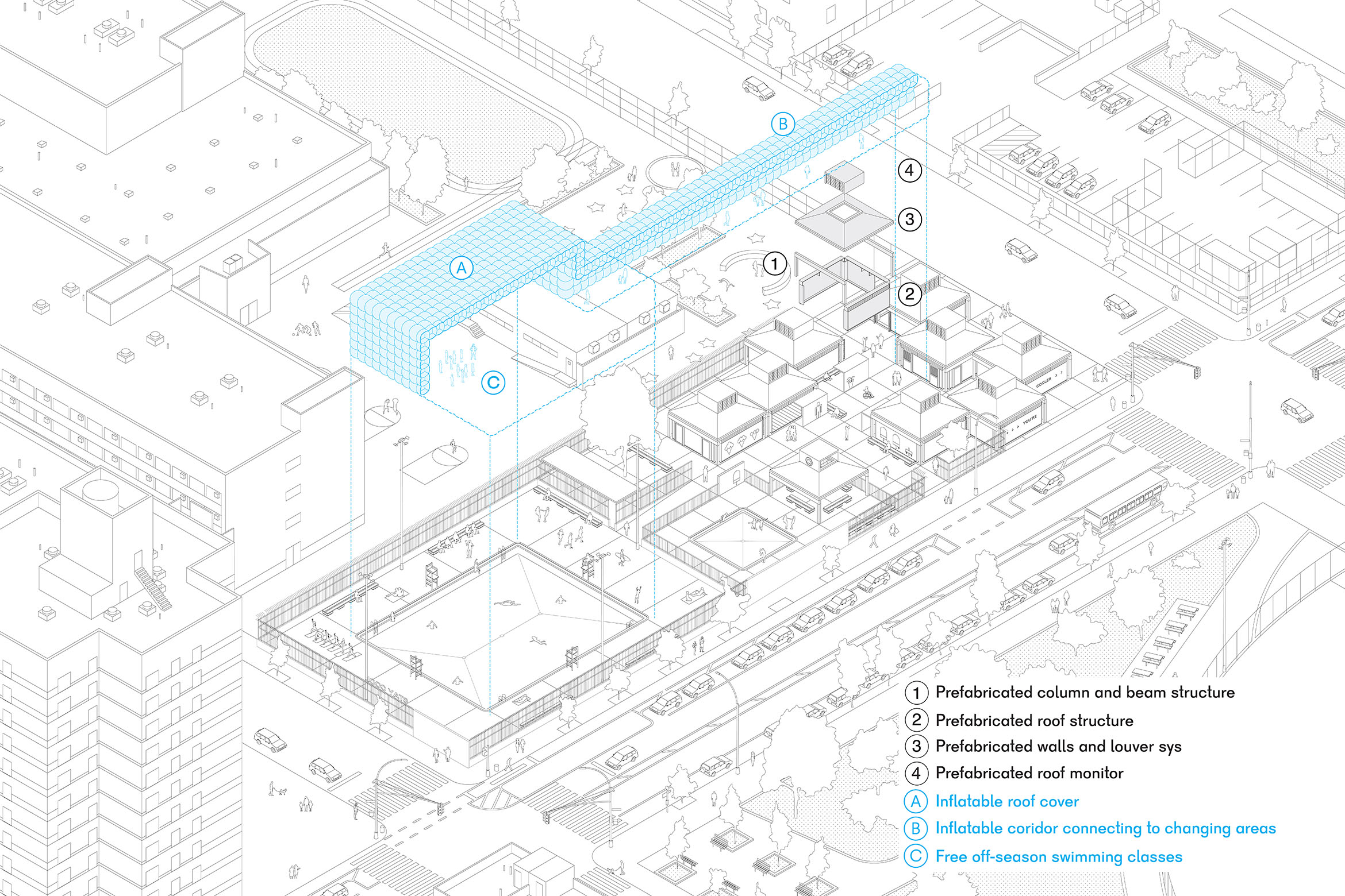 What if vest-pocket pools had temporary, inflatable pool covers to extend the swimming season beyond the summer? A heated enclosure would allow free, public Learn to Swim programs to continue during the school year, providing more children with lifesaving skills. A longer swimming season would also offer additional exercise opportunities for adults. The modular nature of vest-pocket pools, which originally allowed for their rapid deployment across the city, allows them to accommodate a simple, adaptable cover that could be used at any of the sites.
