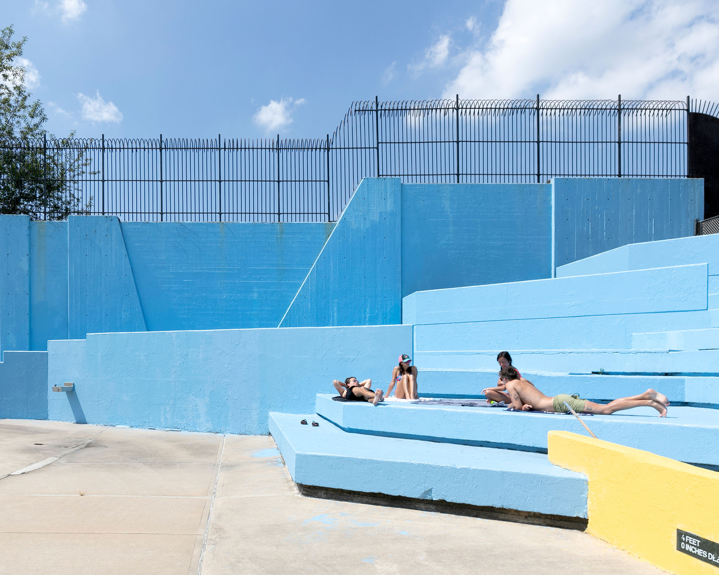 Kosciuszko Pool represents one of several atypical public pools that don’t belong to any of the previous typologies. The architectural and social ingenuity of the Kosciuszko Pool — K-Pool, or the People’s Pool, as it is often called — is readily visible in the many ways people use its brutalist concrete forms. Half building, half urban landscape, the pool’s design enables a wide range of concurrent activities: play, exercise, and socializing. A large, raised volume dedicated to the playground incorporates mechanical exhausts and pipes as play features. Swimming pools are surrounded by stepped blue sun decks and bleachers that echo the walls ringing the pool deck. Today, the smaller pools and the raised playground remain fenced off due to accessibility and operational issues. The architecture that once embraced joy seems to be missing it.