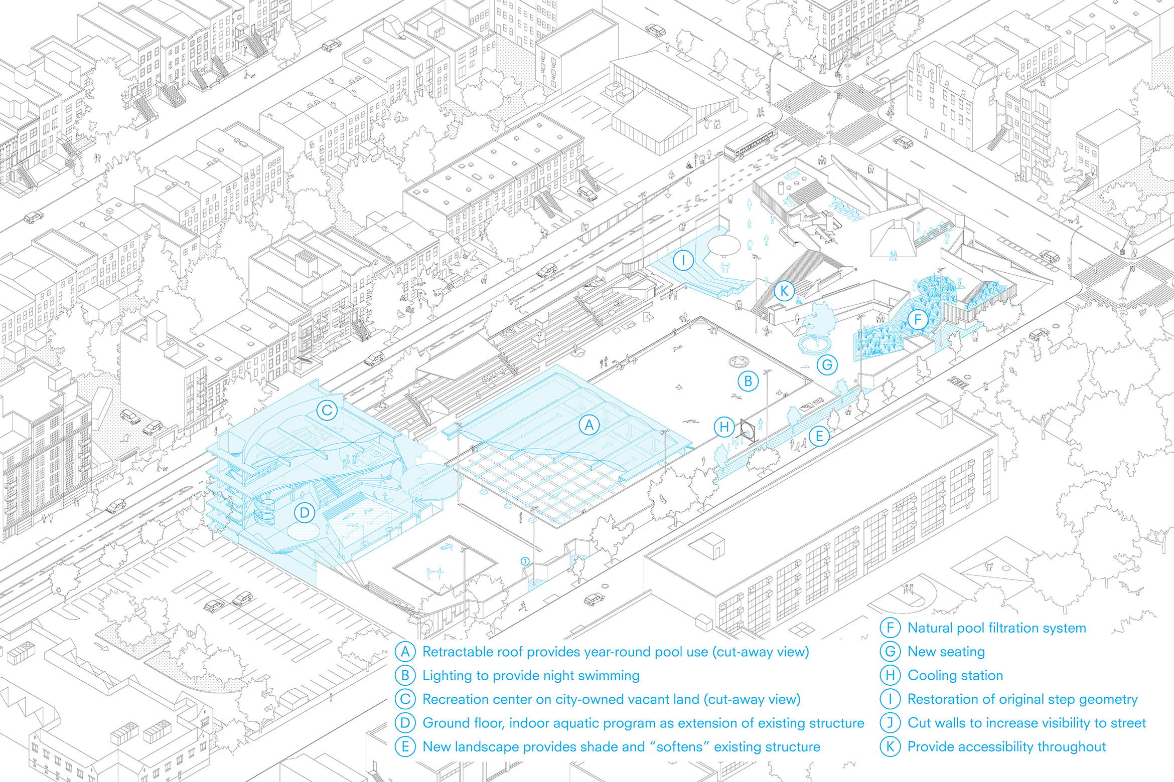 With the integration of policy, innovative programming, and architectural design, the city’s existing pools might be reimagined as sites for social gathering, education, health . . . and year-round swimming. The following speculative interventions — ranging from programmatic extensions to architectural interventions — have been applied to five distinct typologies of New York City pools. Some, such as inflatable pool covers and sauna structures, are designed to extend the swimming season and expand the city’s bathing culture. Others focus on reimagining existing pool buildings and grounds as year-round recreational facilities, cooling centers, and performance venues. Lastly, at Brooklyn’s Kosciuszko Pool, we envision a new indoor bathing, recreation, and lifeguard training center, along with a partial permanent pool cover and smaller interventions that highlight the pool’s exceptional architecture and make it more accessible for users.