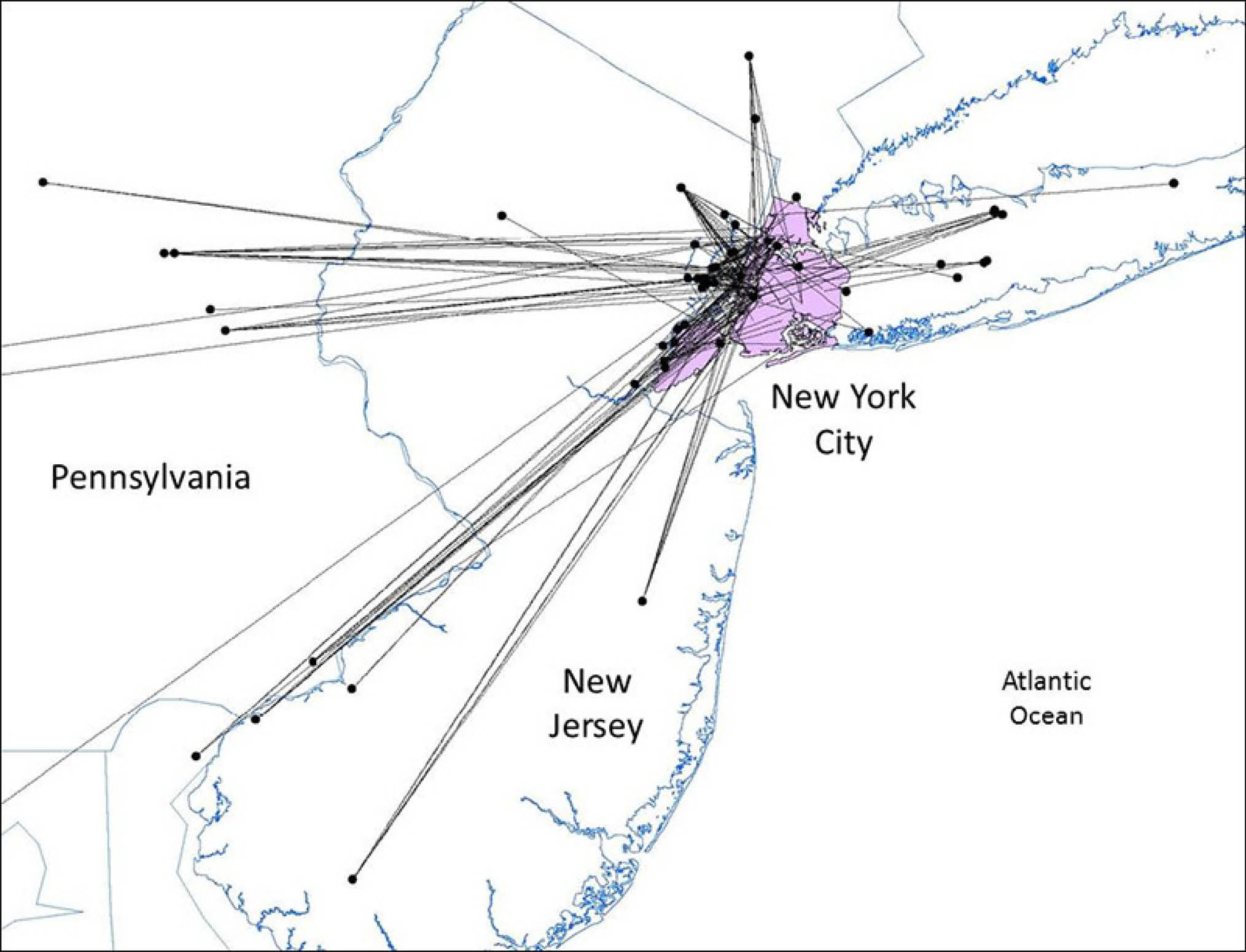 A map tracing soil movement out of New York City between 2009 and 2016. Image courtesy of Dan Walsh