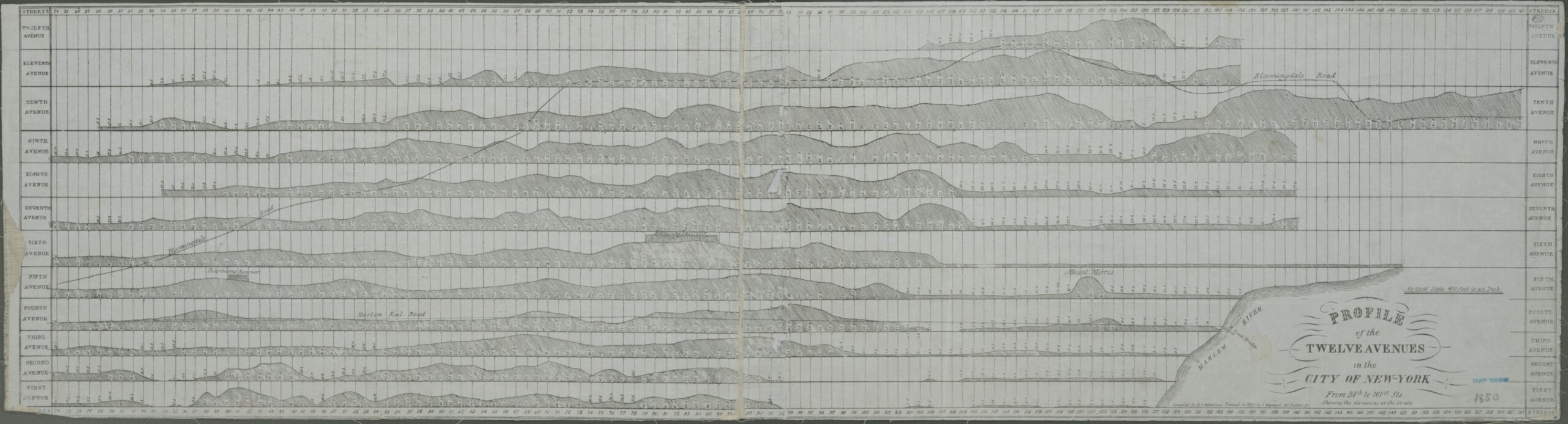 An elevation map of Manhattan’s avenues from 1850 shows dramatically more hills than the borough has today. Map by George Hayward and D.T. Valentine via the <a href="https://digitalcollections.nypl.org/items/f1d73470-c5aa-012f-4f5e-58d385a7bc34?canvasIndex=0" target="blank">Lionel Pincus and Princess Firyal Map Division, New York Public Library</a>