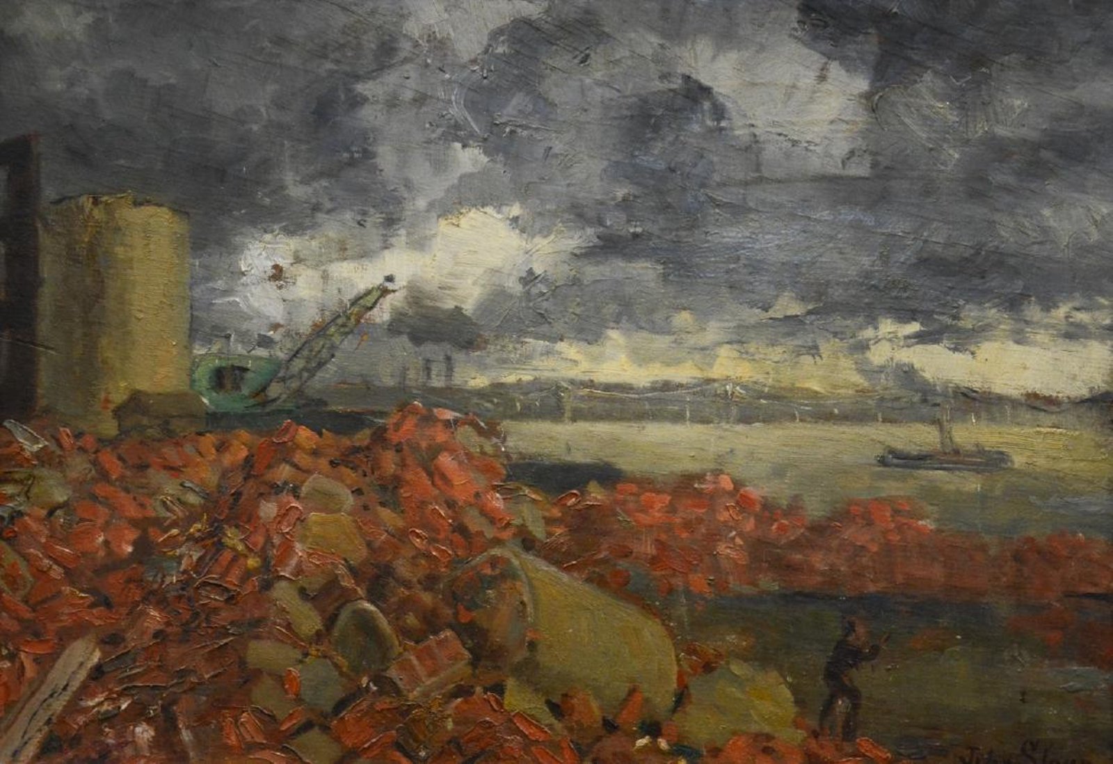 An Ashcan School painting depicts bricks from Bristol’s wartime rubble being placed in the East River as part of a land reclamation project. Image via the <a href="https://stewardarchives.com/2017/09/27/art-at-auction-john-sloan-and-bristol-bricks-1941" target="blank">Steward Archives</a>