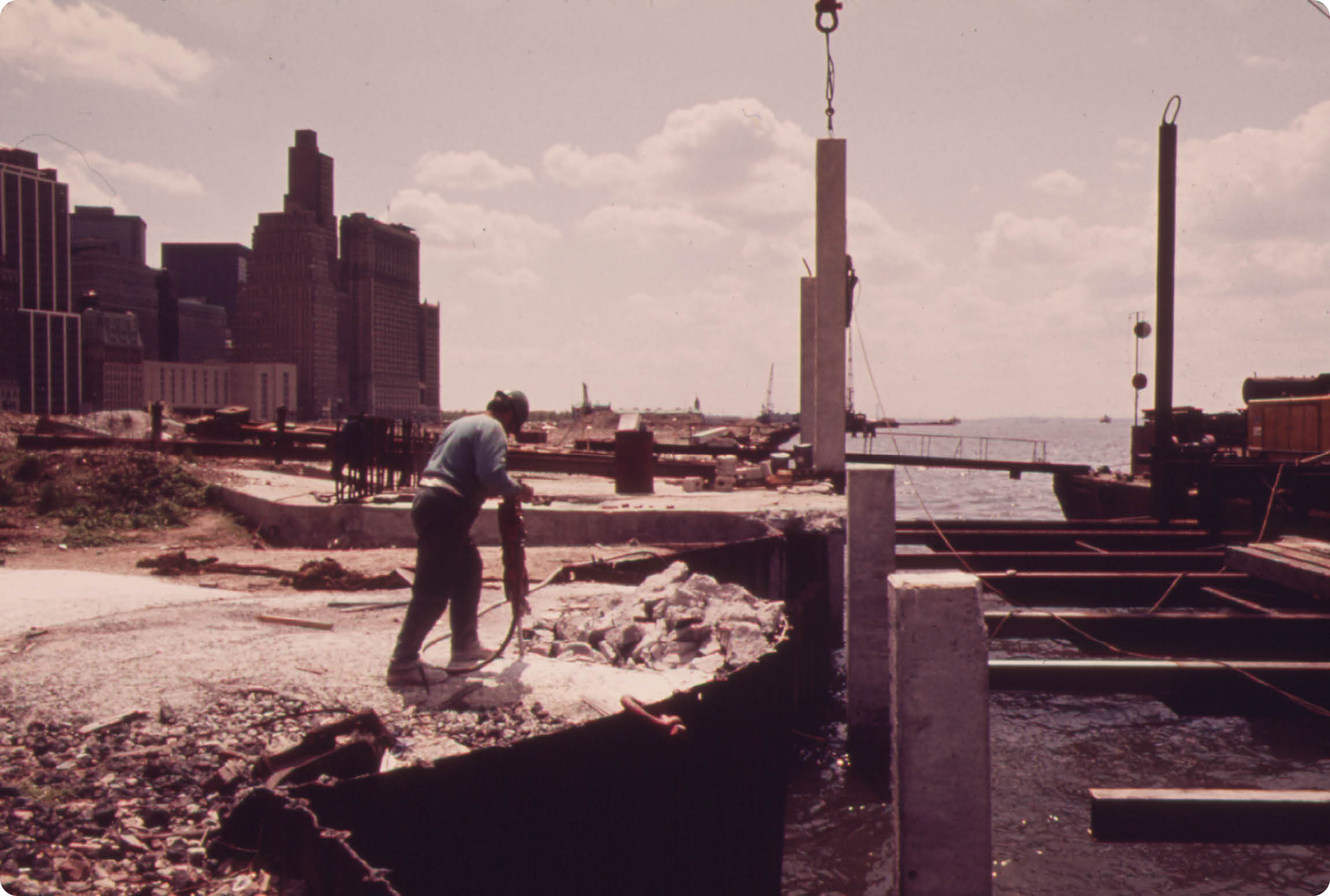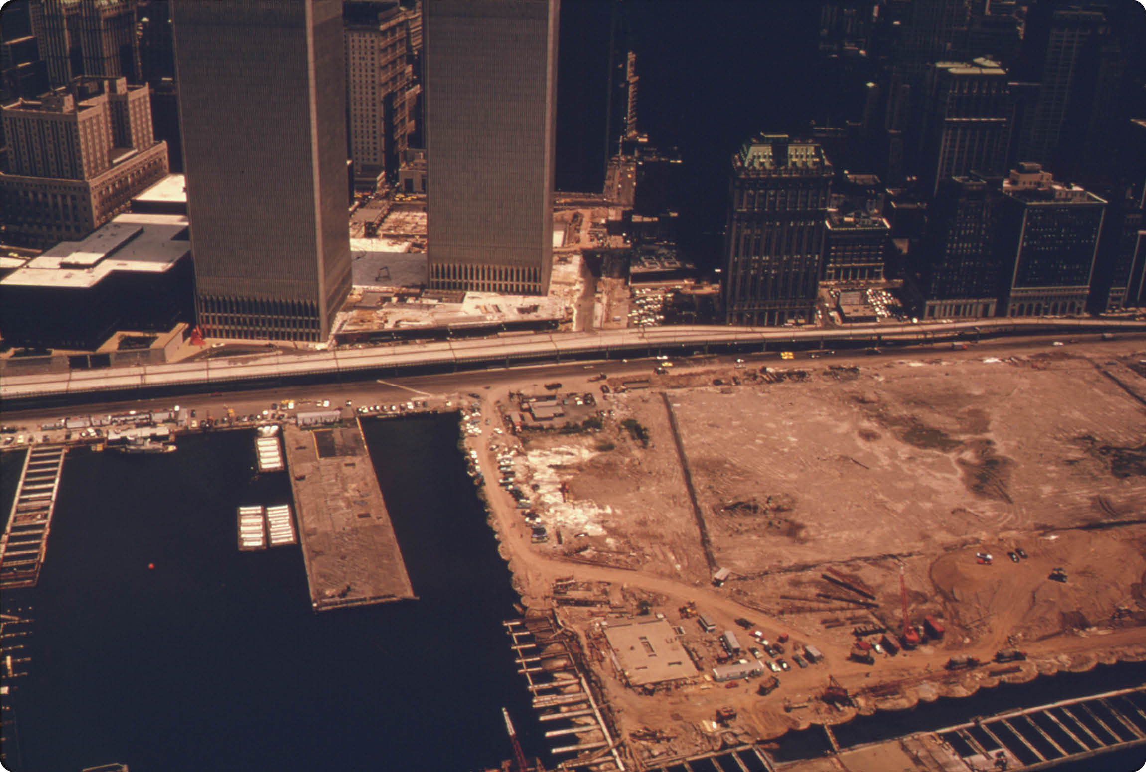 Construction of Battery Park City in 1973. Photo by Wil Blanche, via the <a href="https://catalog.archives.gov/id/549309" target="blank">National Archives</a>