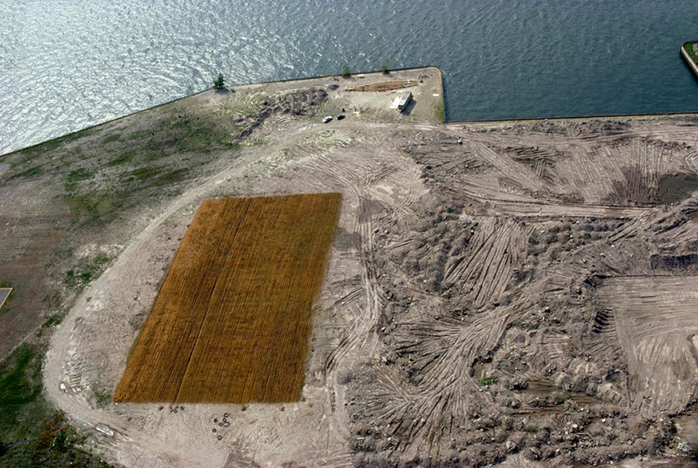 Wheatfield - A Confrontation: Battery Park Landfill, Downtown Manhattan - Aerial View, by Agnes Denes, 1982. Copyright Agnes Denes