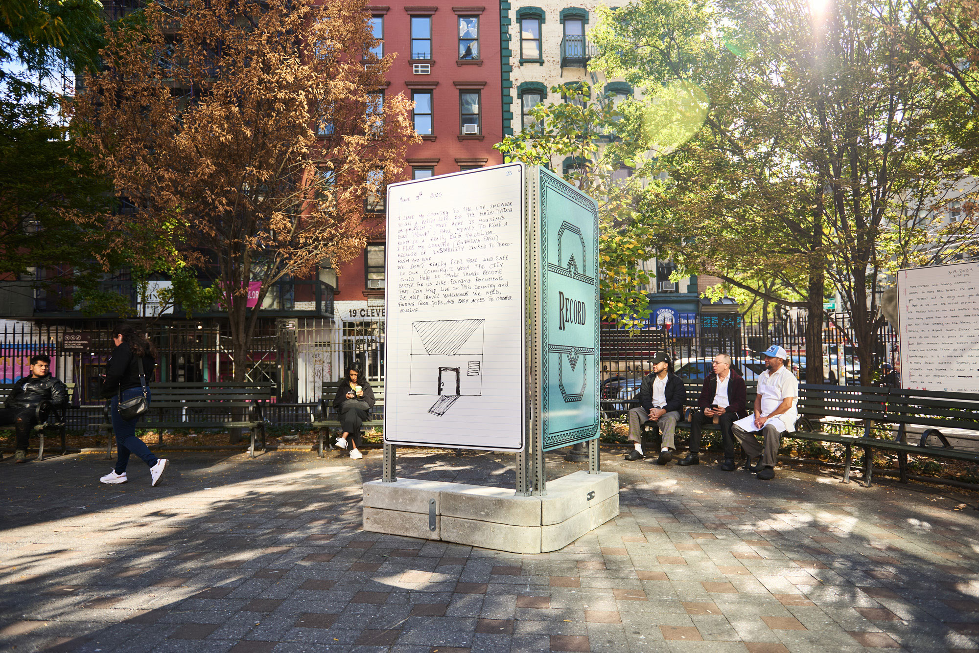 Smaller street signs have been affixed to poles and other structures across Manhattan, one in each community district. Directly opposite Gramercy Park, a message reads: “The only true failure that homelessness represents is a societal and governmental failure to protect its citizens and provide them with access to safe, affordable, accessible and desirable housing, which is necessary for individual and community wellbeing and growth.” Another, opposite the Washington Square Arch, reads: “I would like folks to understand that homelessness for many people was a direct result of escalating rents and the current astronomical cost of living in NYC.” Moving throughout Manhattan’s more affluent neighborhoods heightens the effect of this walking meditation on the housing crisis.