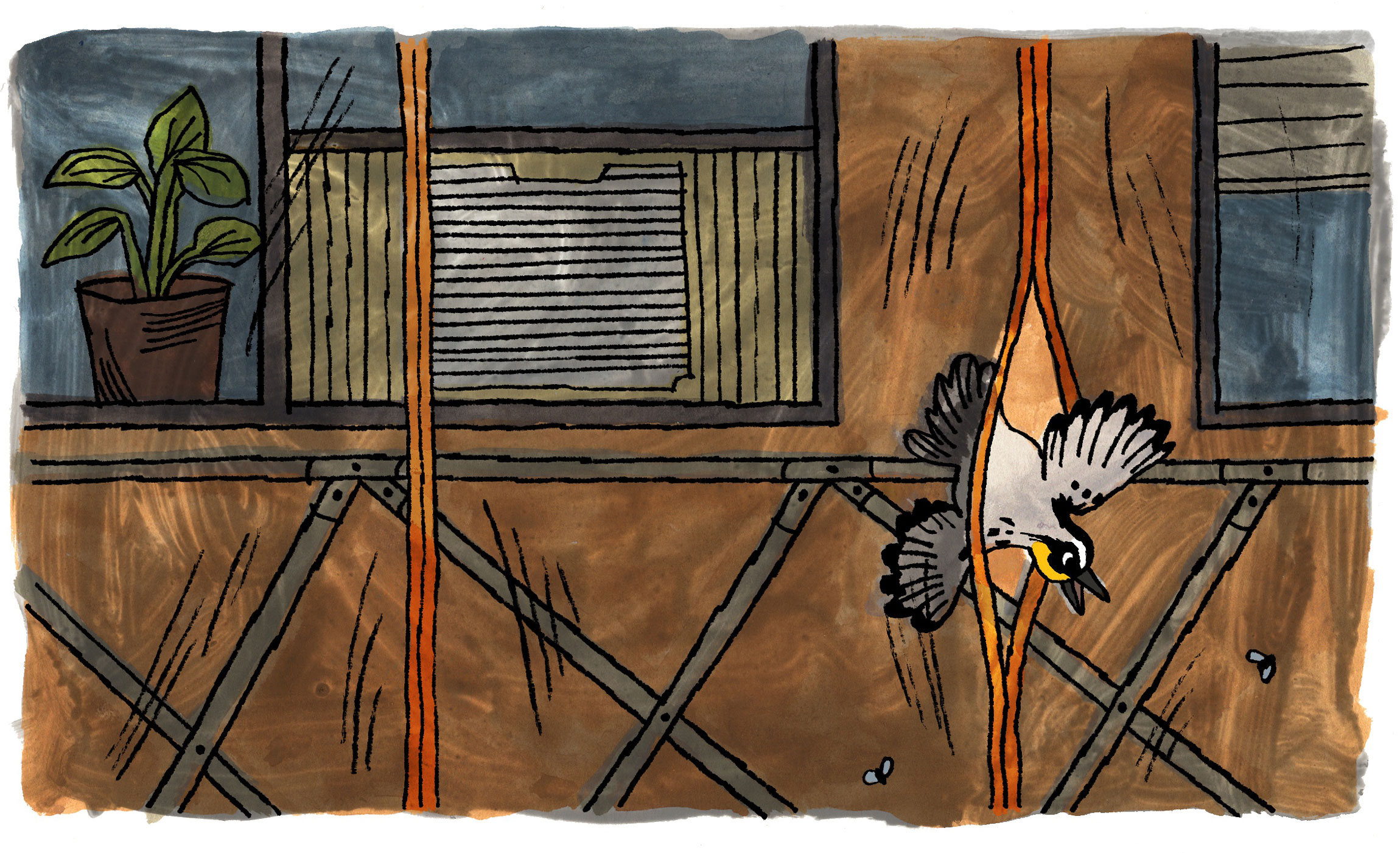 Not all encounters with urban wildlife seeking out heat are as wholesome, or desired, as my moments watching the yellow-throated warbler forage in the scaffolding. A few days before I visited the bird, my cat discovered an insect crossing my ceiling, and alerted the household to the intruder by circling below it, clicking and hissing. When I got close I found a beautiful little bug — shield shaped, with intricate striping — which was unfamiliar to me, as most insects are. Conveniently, it happened to be crawling just above the shelf where I keep my insect field guide. I opened the book and identified it as a brown marmorated stinkbug: an agricultural pest native to East Asia whose habit of entering human-warmed buildings has allowed it to expand into cold environments around the world. The insects wait out winter indoors (occasionally by the tens of thousands), and then move back outside when the weather turns. The field guide on hand proved just as convenient for handling the pest as for identifying it.