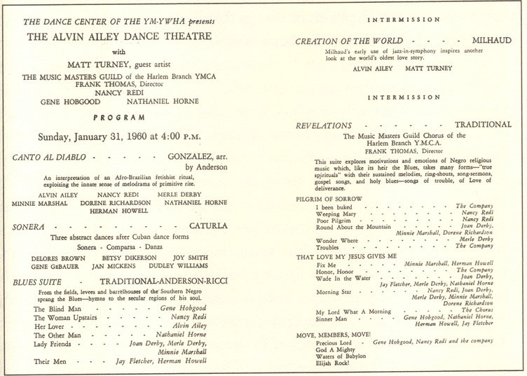 The program for the premiere of Alvin Ailey’s Revelations, which took place in 1960 at the 92nd Street Y. Image courtesy 92NY Archives