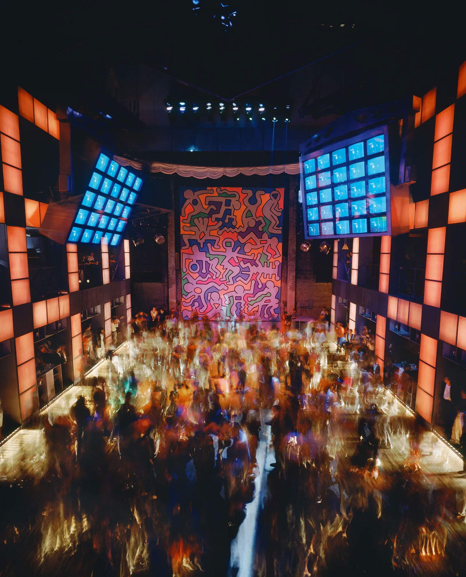 The dance floor at the Palladium in the 1980s, with a mural by Keith Haring